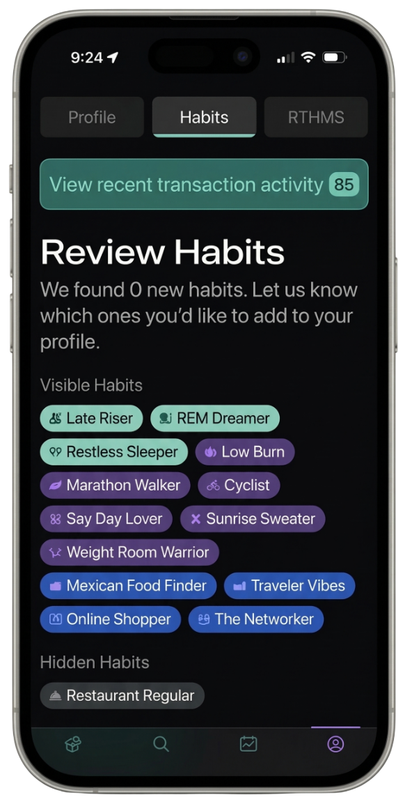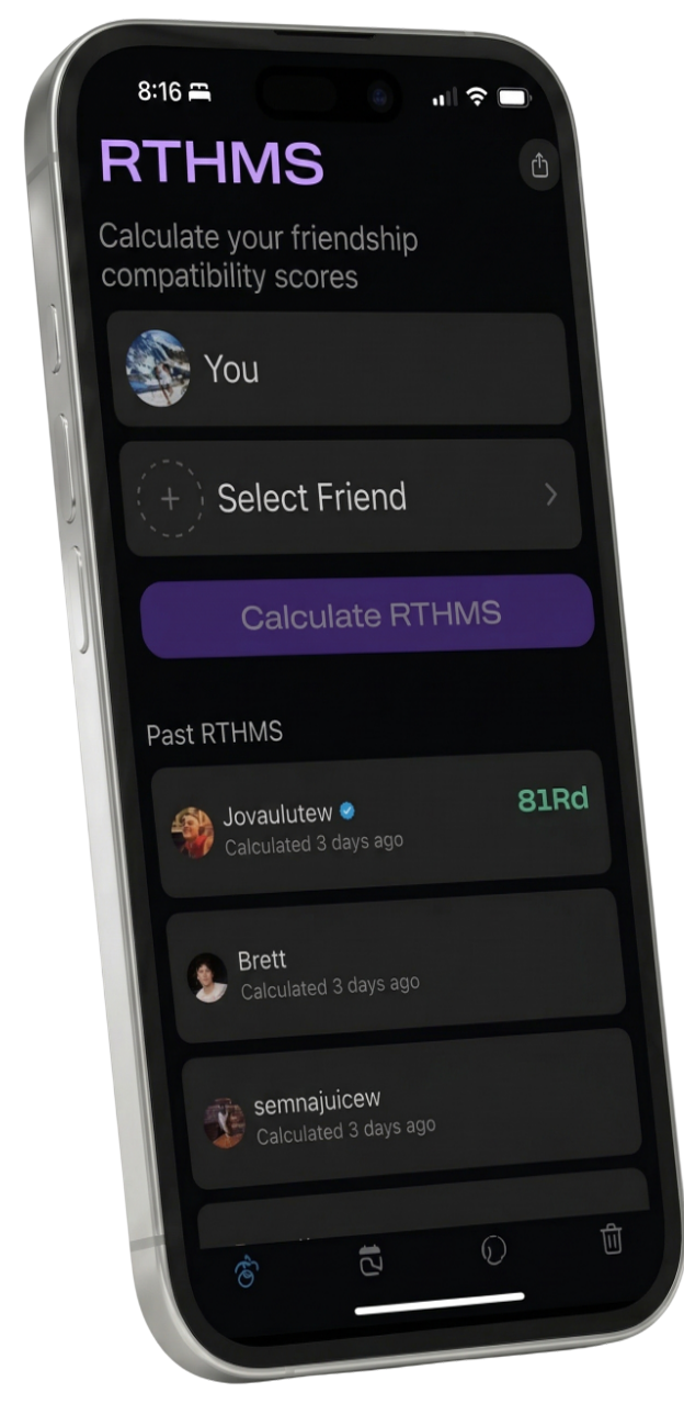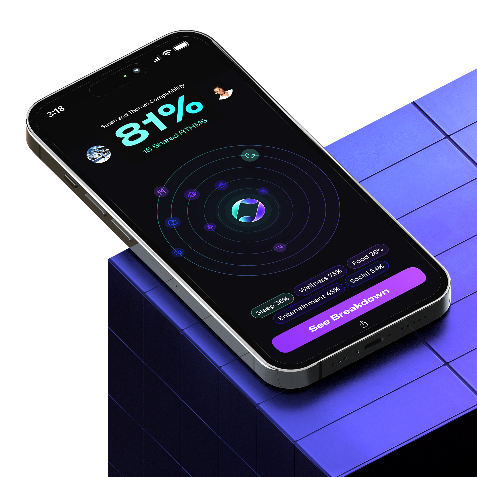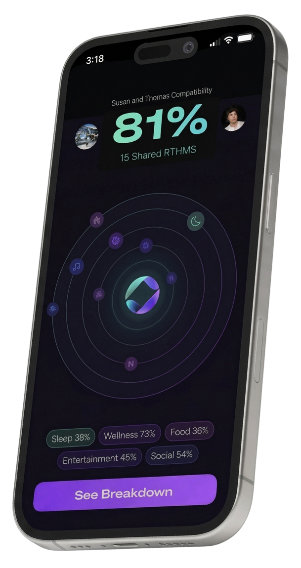 We transform real-life patterns into a living compatibility profile, revealing how people actually move through life, not just how they describe themselves. From dating to friendships, roommates, and teams, RTHMS connects people through shared rhythms and aligned lifestyles. Profiles evolve. Compatibility updates.